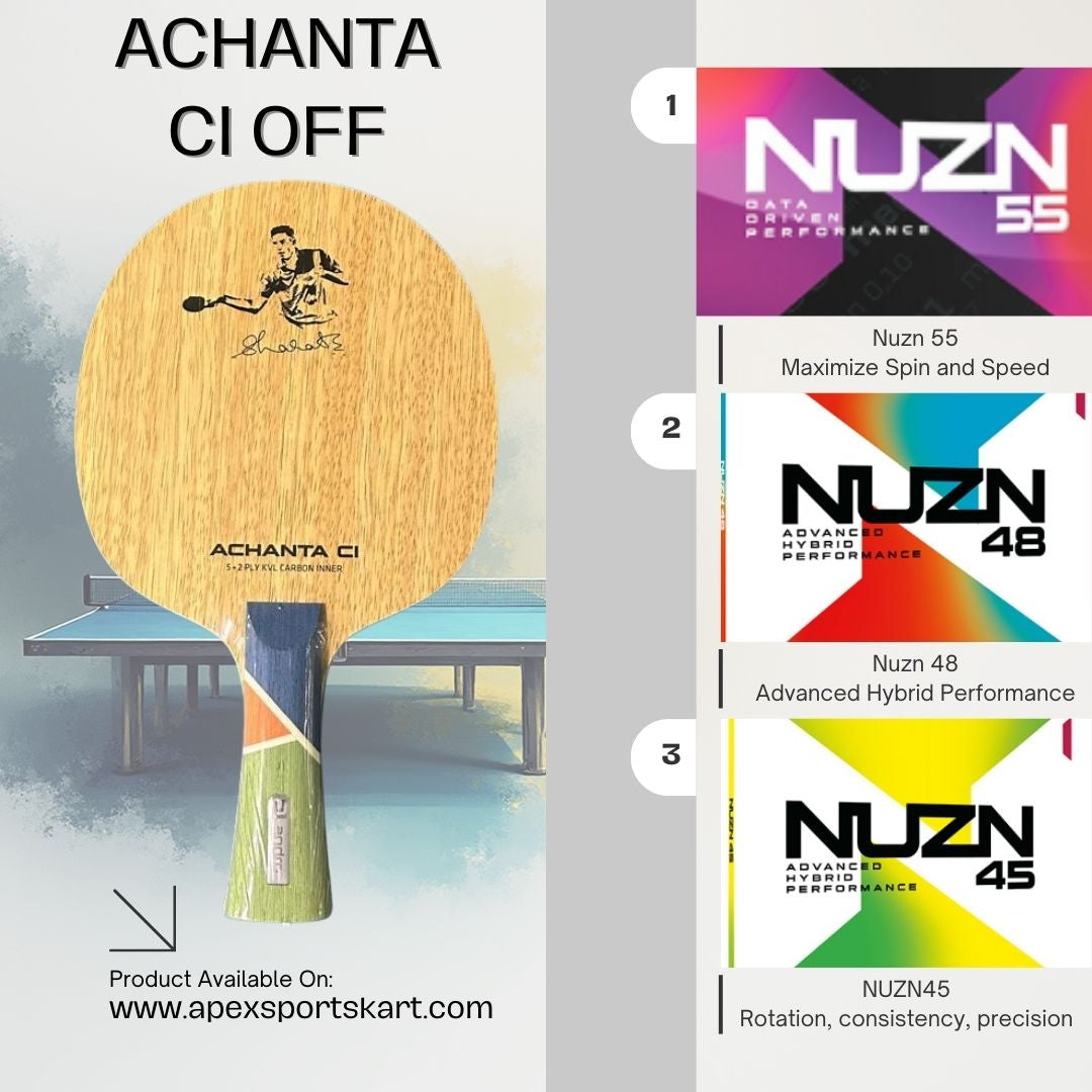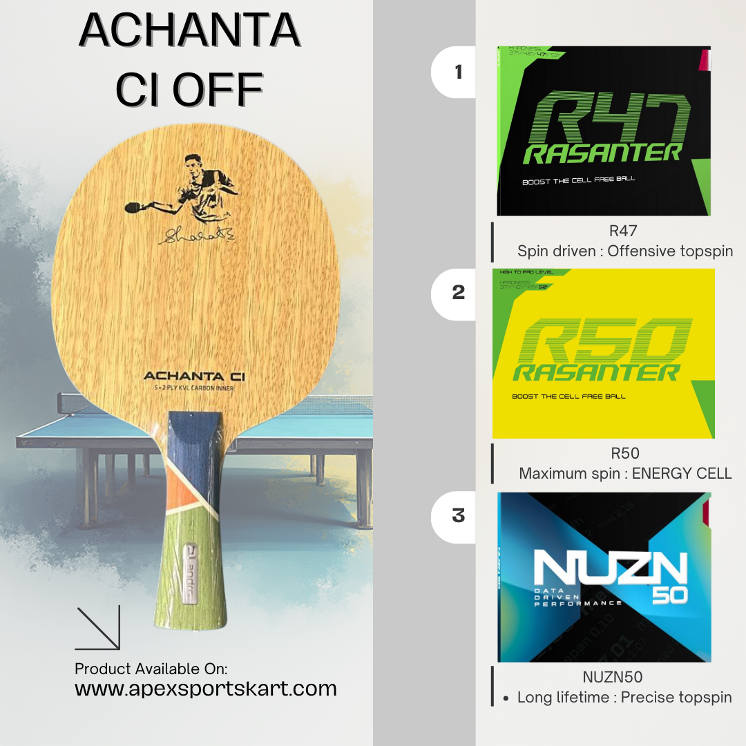 Developed from years of experience on and off the table, this blade is designed for excellence!!! Presenting the Achanta CI OFF blade from the Achanta Sharath Kamal series.